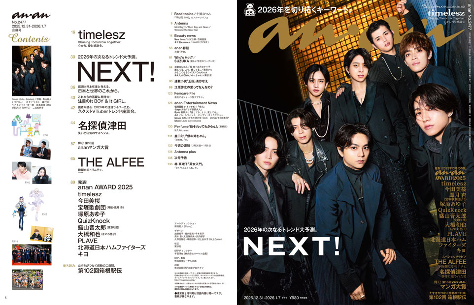 発表! anan AWARD 2025 timelesz 今田美桜 宝塚歌劇団(月組・鳳月 杏) 塚原あゆ子 QuizKnock 盛山晋太郎(見取り図) 大橋和也(なにわ男子) PLAVE 北海道日本ハムファイターズ キヨ |