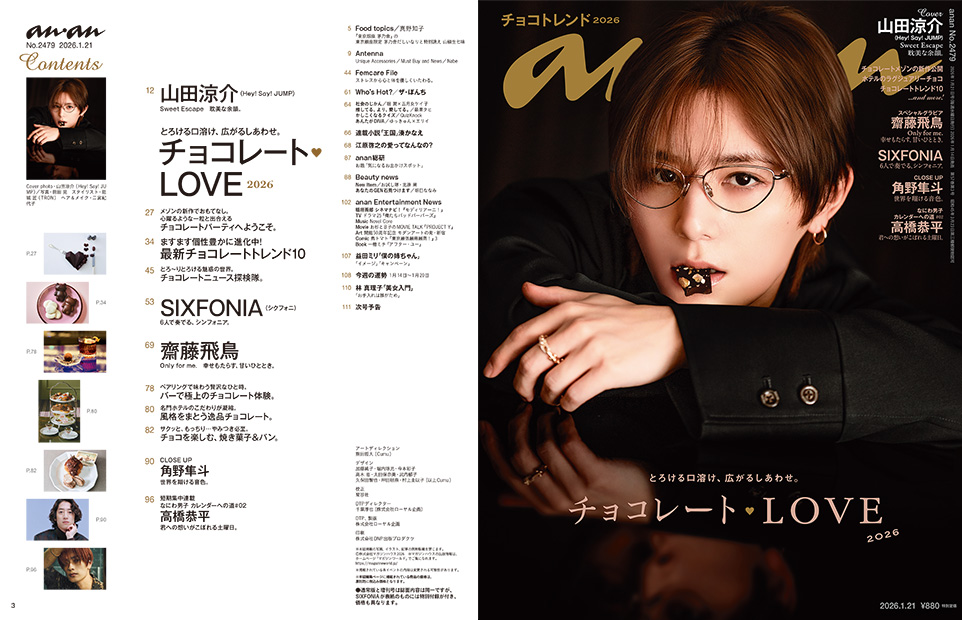 『anan No.2479』『anan No.2479増刊』『anan No.2479 Special Edition』は、表紙と特別付録の有無のみが異なり内容はすべて同一です。