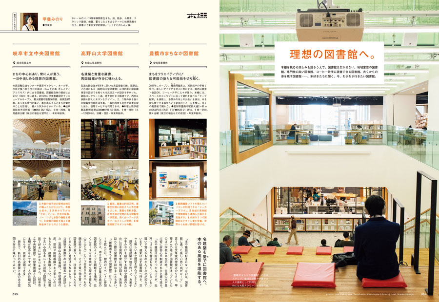 理想の図書館へ。 豊橋市まちなか図書館 / 高野山大学図書館 / 岐阜市立中央図書館 / オーテピア高知図書館 / 武蔵野プレイス / 地中図書館 / 国立国会図書館国際子ども図書館 / 日比谷図書文化館 / 稲城市立中央図書館 |