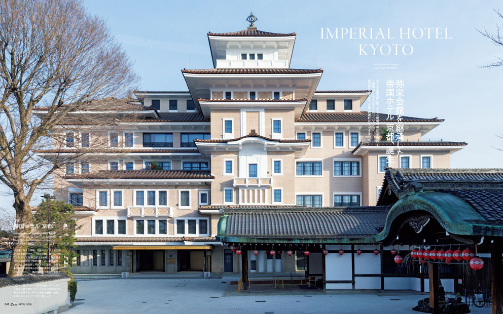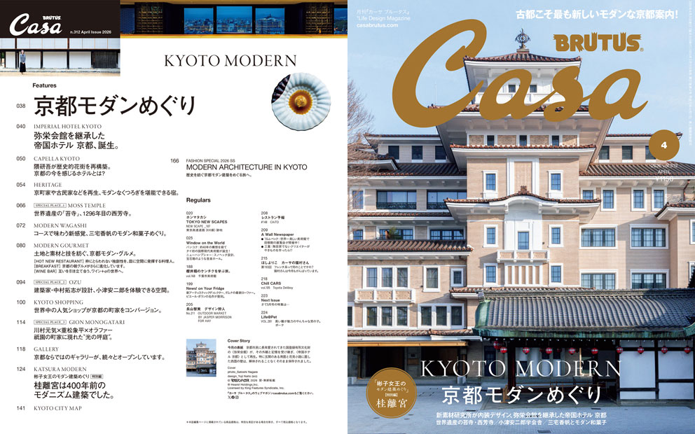 近年の京都は「モダン」というキーワードが盛り上がりを見せています。昭和初期の1936年に竣工した国登録有形文化財のモダン建築〈弥栄会館〉、その外観と記憶を継承した〈帝国ホテル 京都〉が3月5日に開業。内装デザインは「旧素材こそ最も新しい」という理念を掲げる、現代美術作家・杉本博司と建築家・榊田倫之が率いる新素材研究所です。2022年に文化庁京都移転記念事業として始まった、京都の近代建築が特別に公開される『京都モダン建築祭』も盛況です。そこで『カーサ ブルータス』6年ぶりの京都特集は「モダン」がテーマ。古都の記憶や近代の遺産を現代にアップデートするモダンな京都をめぐります!