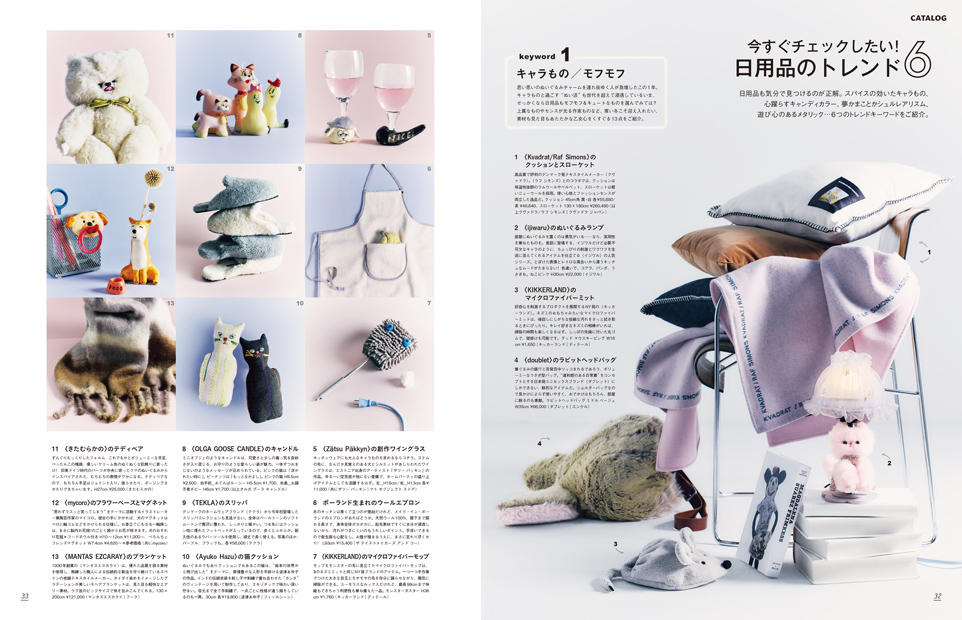 | 032 | 今すぐチェックしたい! 日用品のトレンド6 キャラもの/モフモフ、キャンディカラー、シュルレアリスム メタリック、香りのオブジェ、フルティガー・エアロ |