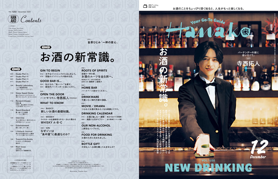 お酒がそばにあるのは当たり前になってきたけれど、自分たちの世代にふさわしい“今の”お酒の知識、改めて学びたくないですか?今注目のお酒の種類とその飲み方、お酒と料理の合わせ方。シチュエーション別のお酒の買い方、贈り方。最近増えてきたノンアルコールの新しいつきあい方。そして、バーの重厚な扉を開ける勇気が出るマナーと作法。新しい酒場旅への提案も。お酒との付き合いがもっと気楽に&身近になる、“お酒の新常識”をHanakoと一緒に考えてみませんか?目印は、バーテンダーの制服をスマートに着こなすtimeleszの寺西拓人さん。Hanako初登場です!