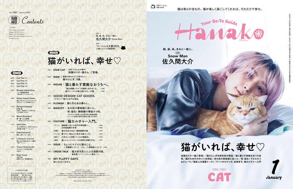 Hanako10年ぶりの猫特集は「幸せ」がキーワード。猫と一緒に暮らす幸せ、あの店の看板猫を愛でる幸せ、SNSを通してスター猫を見守る幸せ、愛猫にかわいいグッズを貢ぐ幸せ、アートに映画にマンガに…カルチャーの中に猫を見つける幸せ、そして、新しい家族として迎える幸せ。猫が私たちにくれる「幸せ」を詰め込みました。表紙と巻頭には、猫好き代表・Snow Man佐久間大介さんが、単独表紙初登場!