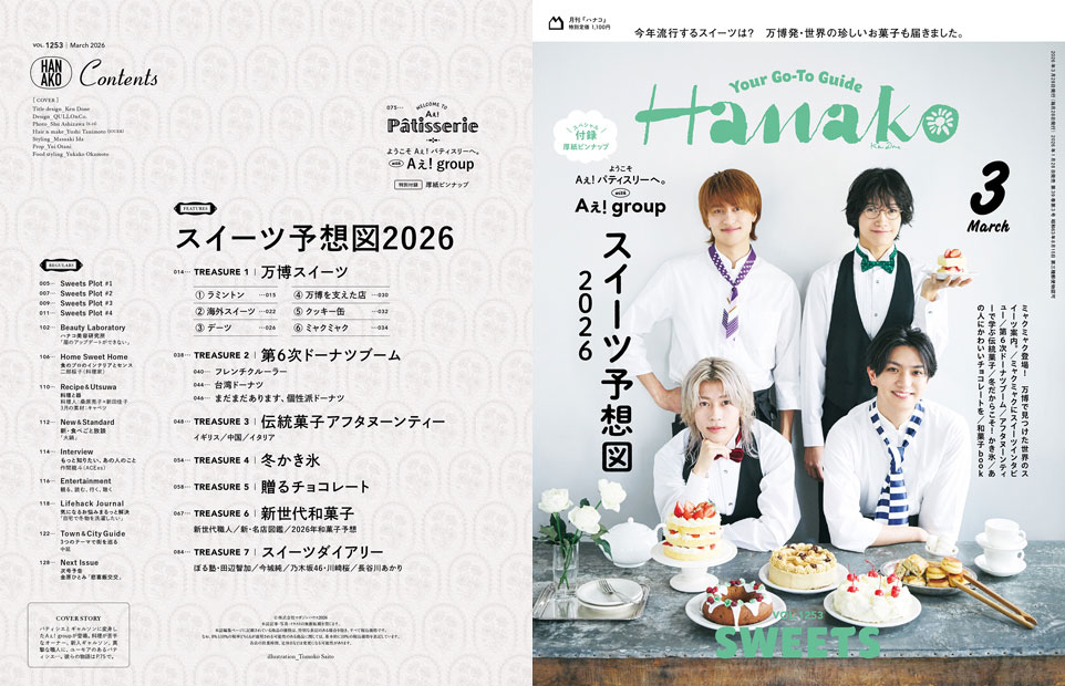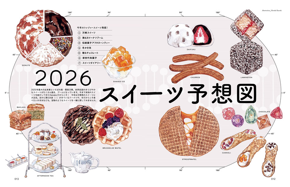 毎年恒例、今年のトレンドスイーツを予想するHanakoのスイーツ特集。今年は、2025年一番の話題だった大阪・関西万博で日本に上陸した海外のスイーツが流行する見込みです。また、ドーナツブームの中でも注目の新・ドーナツ、冬だからこそ食べたいかき氷、2026年注目の和菓子など、目新しいスイーツ情報が盛りだくさん。スイーツ好きでお馴染みのぼる塾・田辺さん、乃木坂46の川﨑桜さん、料理家長谷川あかりさんたちの個人的ヒットスイーツも。長い歴史の中、未知のスイーツを数多く発掘してきた『Hanako』ならではのスイーツ特集をお楽しみください。
