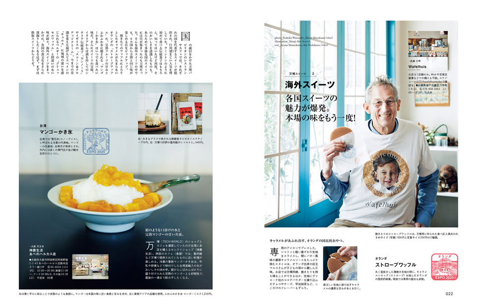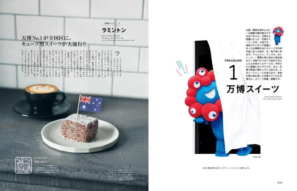 TREASURE 1 | 万博スイーツ ① ラミントン …015 ② 海外スイーツ …022 ③ デーツ …026 ④ 万博を支えた店 …030 ⑤ クッキー缶 …032 ⑥ ミャクミャク …034 |