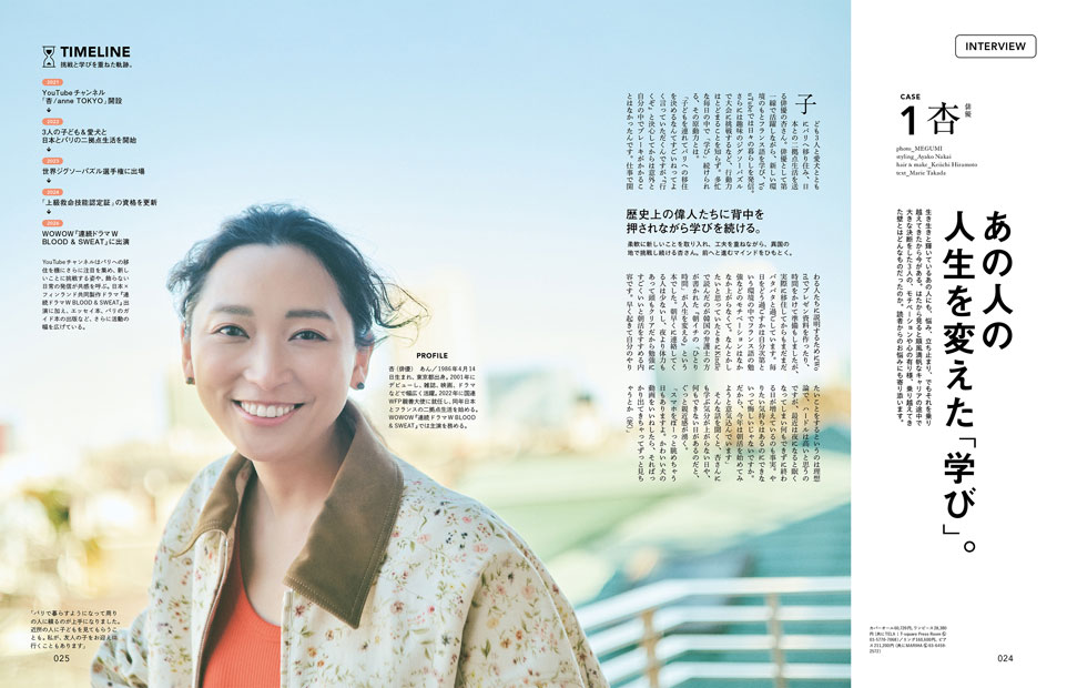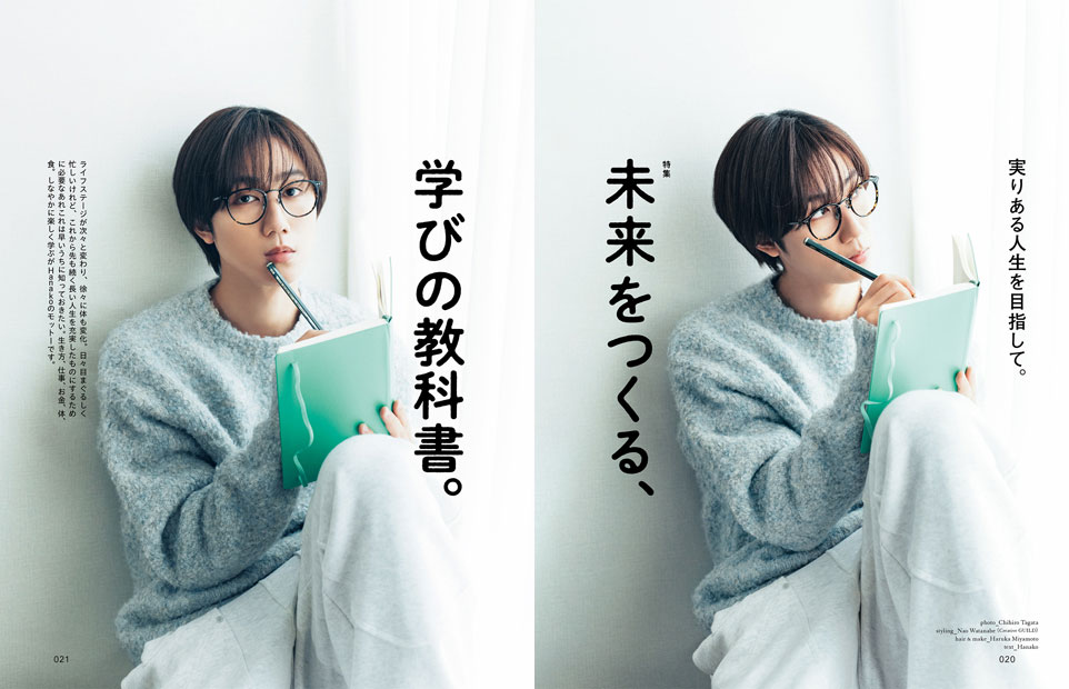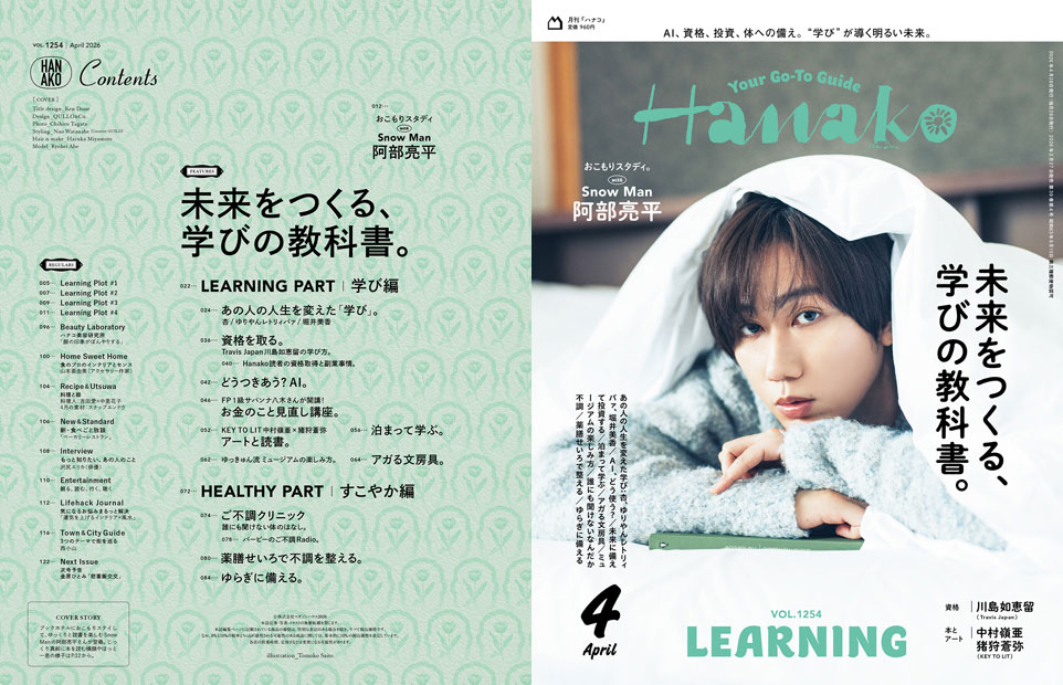 ライフステージが次々に変わり、体も徐々に変化していくHanako世代、これからの人生をより充実したものにするために必要なあれこれは早めに知っておきたいところ。環境の大きな変化に飛び込むときの決断力、AIとのつきあい方、お金の運用のような真面目なことから、学べるホテル、気分がアガる文房具、体の変化に伴う備え、薬膳せいろ料理など、Hanakoらしい楽しい学びも。表紙は学び特集の顔、Snow Manの阿部亮平さん。また、Travis Japanの川島如恵留さんが資格の取り方、KEY TO LITの中村嶺亜さんと猪狩蒼弥さんが読書とアートの楽しみ方についてナビゲートしてくれます。