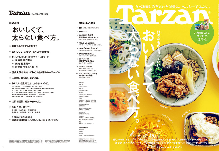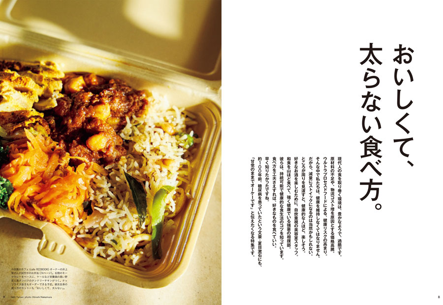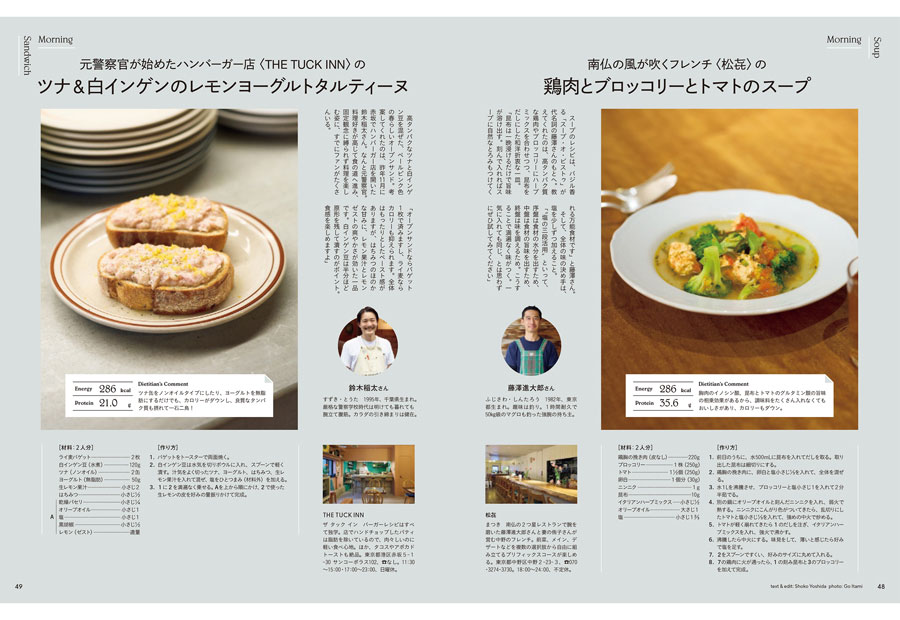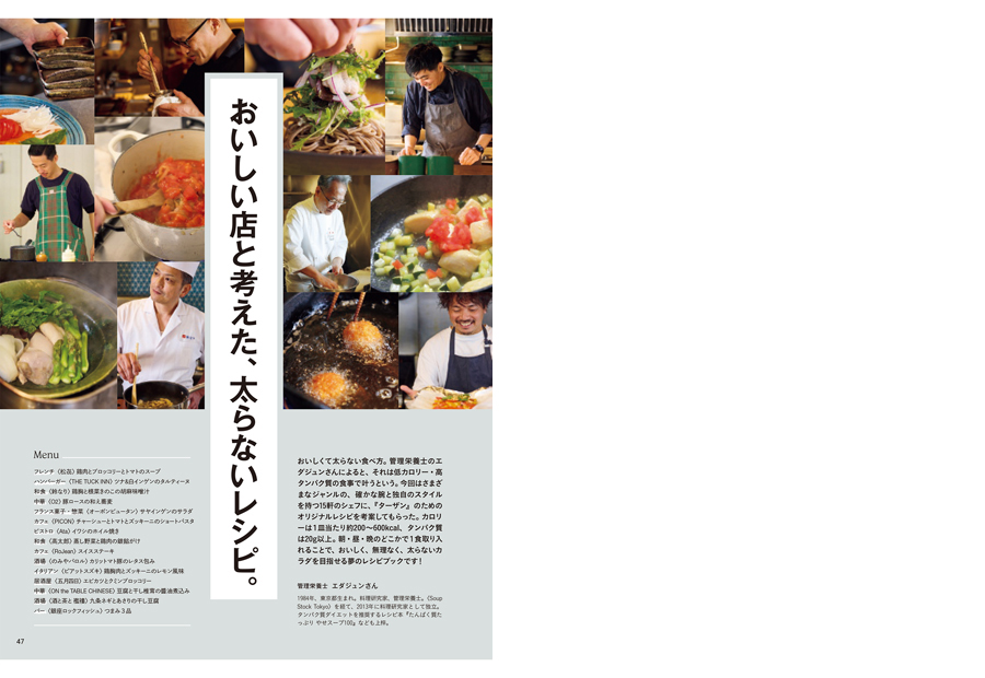 おいしい店と考えた、太らないレシピ。 フレンチ〈松㐂〉/ ハンバーガー〈THETUCK INN〉 和食〈鈴なり〉/ 中華〈O2〉/ フランス菓子・惣菜〈オーボンビュータン〉 カフェ〈PICON〉/ ビストロ〈Ata〉/ 和食〈高太郎〉 カフェ〈RoJean〉/ 酒場〈のみやパロル〉/ イタリアン〈ピアットスズキ〉 居酒屋〈五月四日〉/ 中華〈ON the TABLE CHINESE〉 酒場〈酒と茶と襤褸〉/ バー〈銀座ロックフィッシュ〉 |
